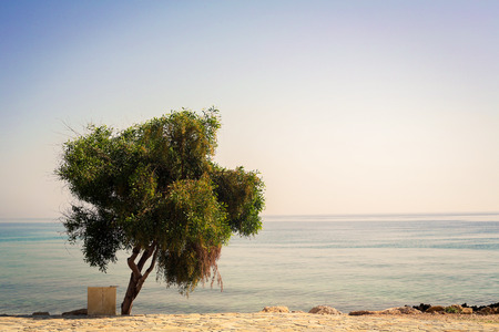 Limassol Cyprus June 10, 2020 View of tree growing in front of the sea on Limassol beach in Cyprus