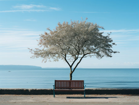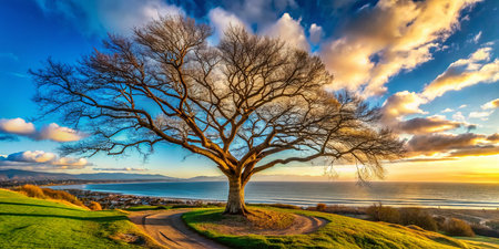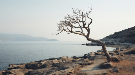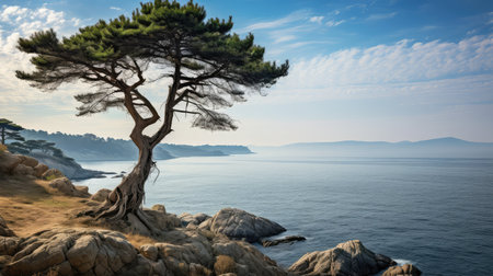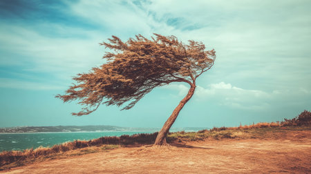 AI Generated. Windswept Tree on Ocean Cliff Under Blue Sky