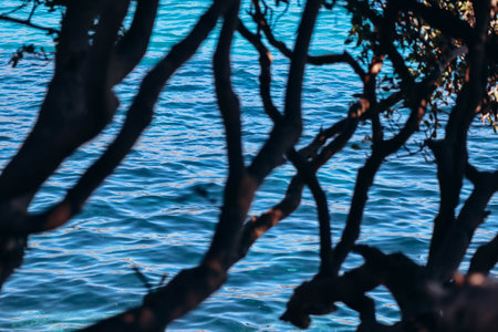 The Mediterranean Sea seen behind the unfocused tree trunks, on the French Riviera