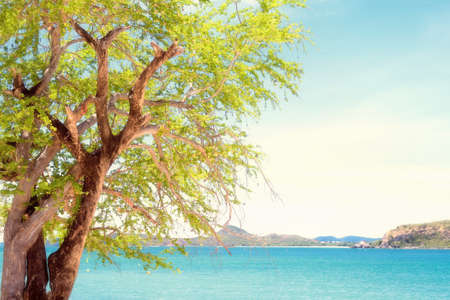 Tree on the beach with sea and blue sky background