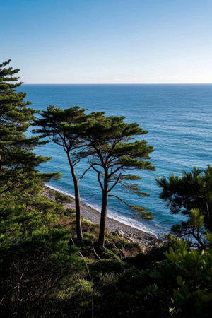 Green trees and blue ocean landscape on the coast