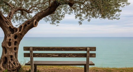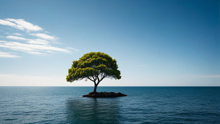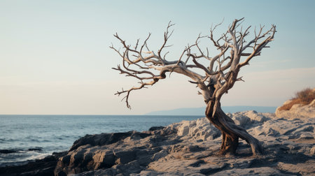 AI Generated. Solitary tree silhouette on rocky cliff edge overlooking tranquil ocean horizon at dusk serene landscape