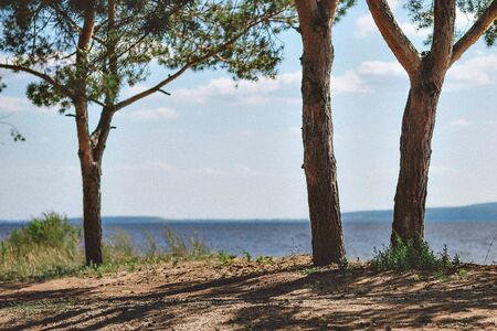 Landscape with a tree on the seashore against the backdrop of a cloudless sky on a summer day.