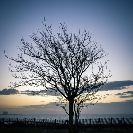 Alone tree without leaves in winter sunrise seascape - Nature landscape