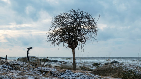 landscape with sea shore and lonely tree, tree with roots at the top, rocks in water and sand, December, Vidzeme rocky seashore, Latvia, winter