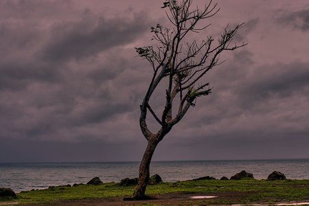 A solitary tree stands against a dramatic ocean backdrop, capturing the resilience of nature. Dark clouds loom overhead while waves crash onto the rocky shore.