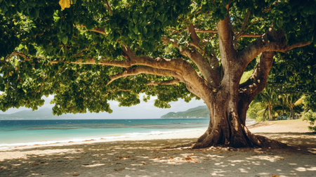 A tropical tree with large, broad leaves providing shade on a sunny beach.