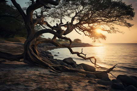 Beautiful sunset at the beach with a big tree on the foreground