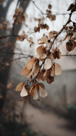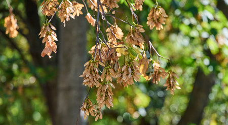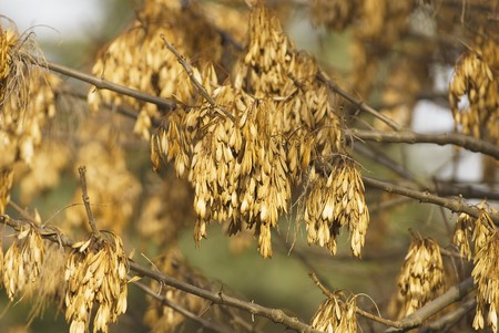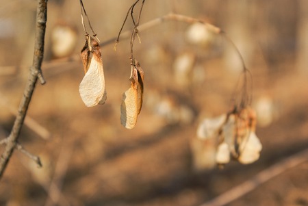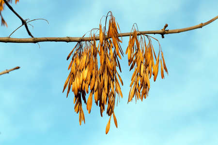 Dry ash seeds. Tree branch with dry seeds. Blurred background. autumn screensaver