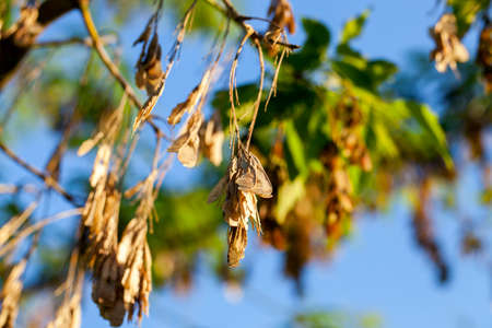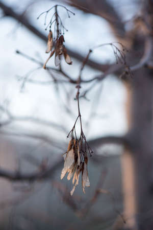 Dry American maple seeds sway in the wind on tree branch. Tree branches without leaves. Autumn season concept.
