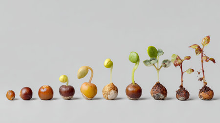 This image showcases the various growth stages of seedlings, illustrating the transition from seeds to young plants against a minimalist background. Perfect for topics on nature, biology, and sustainability.