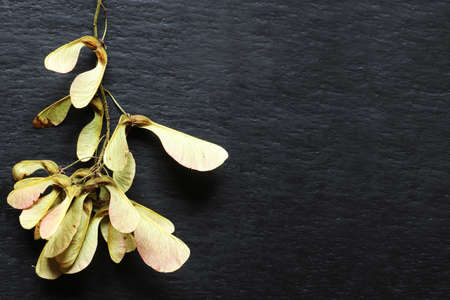 Photography of a handful of dried maple fruits on slate background for menus, labels or signs