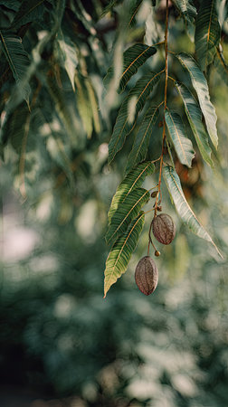 A detailed photograph of a single Black walnut, swaying gently in the wind, captured in natural daylight. Fresh and airy atmosphere, soft motion blur on leaves, crisp details on textures, background softly blurred into natural greenery, cinematic natural light, realistic photography.