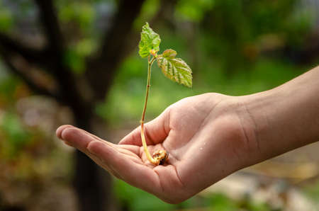 Hands holding young plant with soil