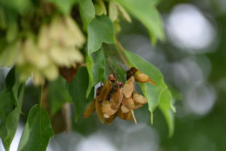 Sunlit dry maple seeds. New green maple seeds in the spring season are out of focus. . Photo close-up. Blue sky and young green foliage of a tree in the background.