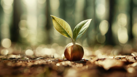 A captivating green seedling emerges from a uniquely textured seed, symbolizing growth, renewal, and the beauty of nature on a rustic wooden surface.
