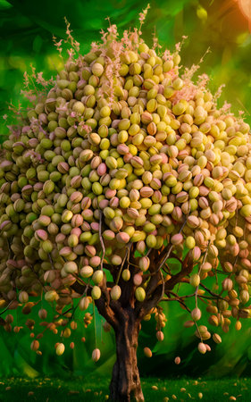 surrealistic pistachio tree with amount pistachio nuts. digital artwork. AI generated.