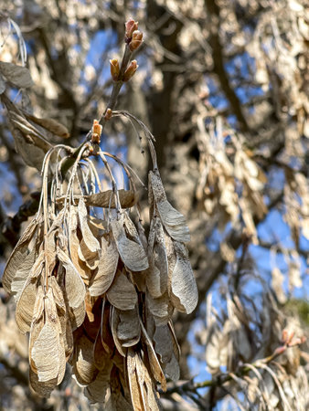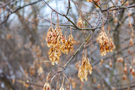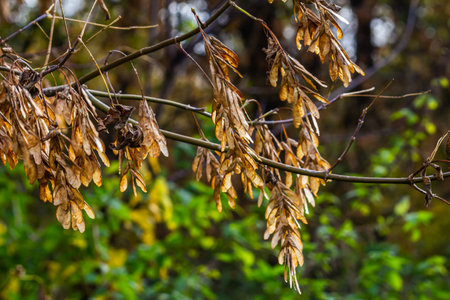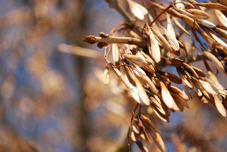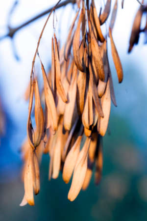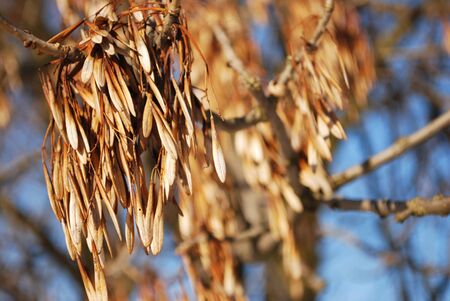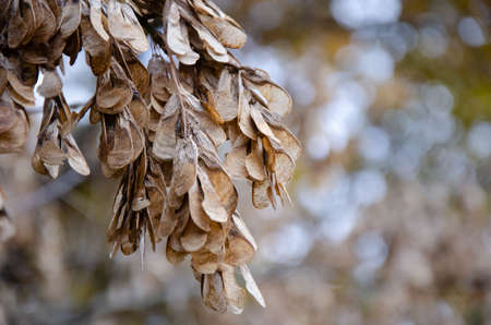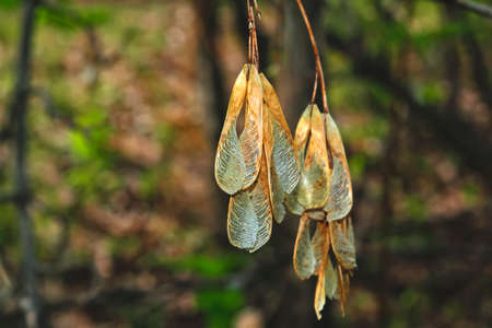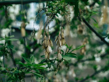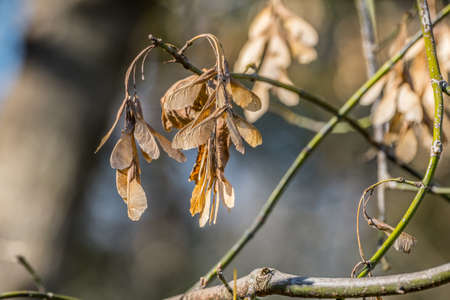 Dry ash seeds. Tree branch with dry seeds. Blurred background