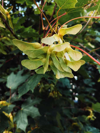 A branch of maple-tree with bunches of seeds and green foliage close-up.
