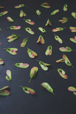 Lot of whole disordered brown winged achene samara isolated on black glass