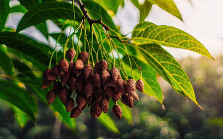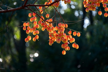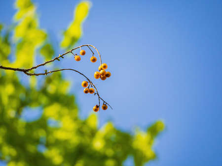 Close-up of the branch with fruits of the Melia tree (Melia azedarach), with sunny background of the image out of focus