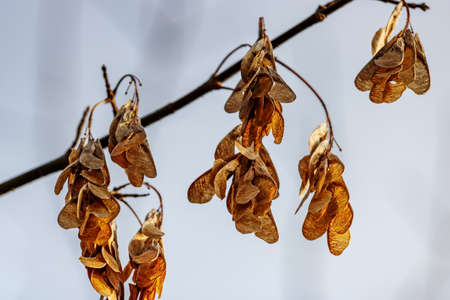 Dry American maple seeds sway in the wind on tree branch. Tree branches without leaves. Autumn season concept.