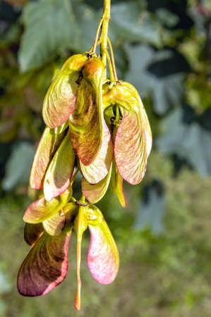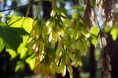 summer sunny day hanging seeds on maple tree branch, blurred background