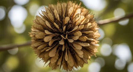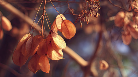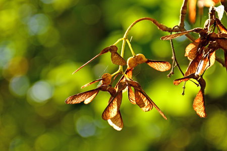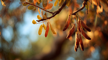 Maple seeds on a branch. Autumn gold coloured with sunlight and soft bokeh sparkles. Blurred natural background with copy space.
