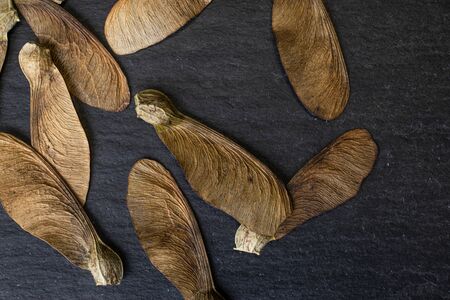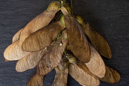 Lot of whole brown winged achene samara flatlay on grey stone