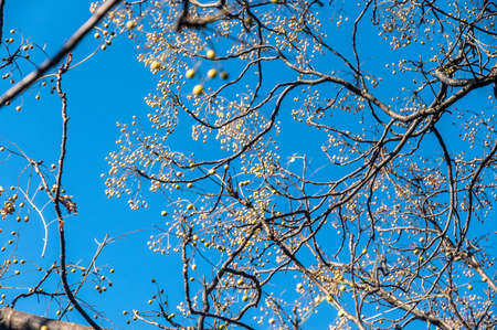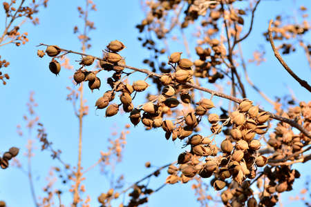 Open seed capsules on the branches of a paulonia tomentosa tree in winter