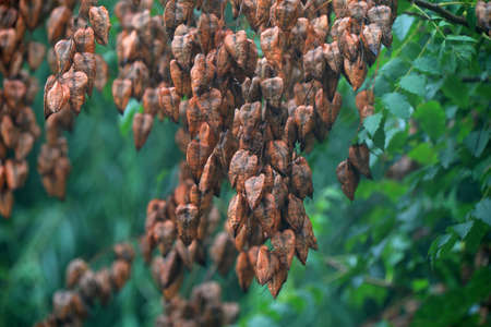Beige covered seads of ash tree hang on the twig.