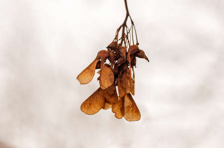 Closeup on brown dry winter maple keys on the background of fresh snow