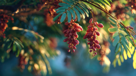 Tamarind swaying gently in the wind, realistic photography style, bright and vivid colors, natural lighting, detailed textures on the leaves, soft motion blur to suggest wind movement, ultra realistic, high resolution, cinematic atmosphere.