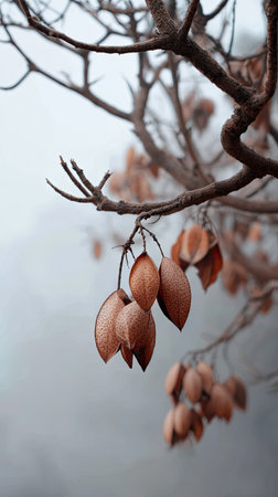 Dried seed pods dangle from bare branches, showcasing winter's effects on a serene nature setting.