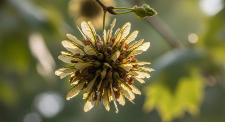 American maple seeds hanging on a branch against a blurred green background.