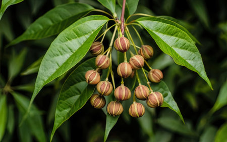 Bunch of green seeds on a branch in the rainforest.