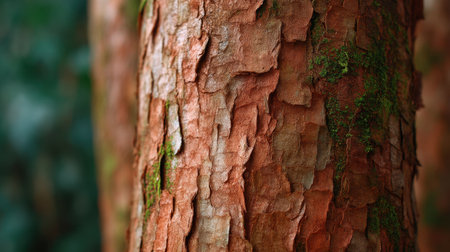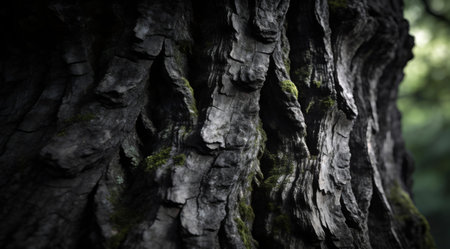Detailed close up of textured tree bark with rough ridges, deep fissures, and earth tone variations. Moss accents the barks natural patterns.