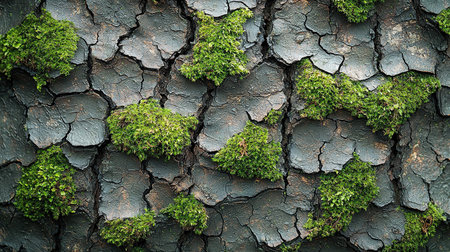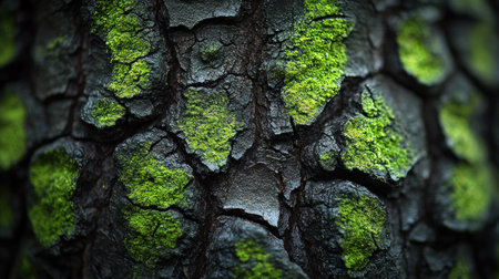 Close-up showcasing vibrant green moss flourishing on the rough, cracked bark of a tree, creating a rich, textured surface.