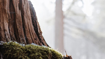 Redwood tree towering above, close-up of bark with small water droplets, soft sunlight. generative ai