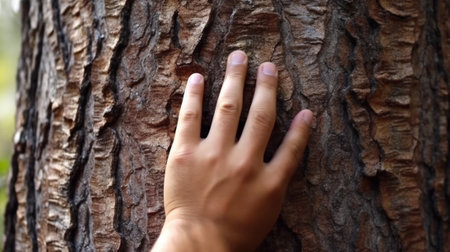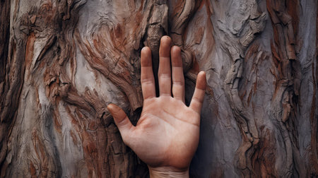 Generative AI : human hand on old tree bark