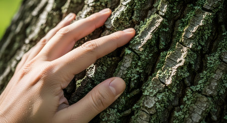 A close-up of a person's hand gently touching the rough, textured bark of an old tree trunk covered in green moss. The image conveys a connection with nature, environmental appreciation, and a sensory experience.