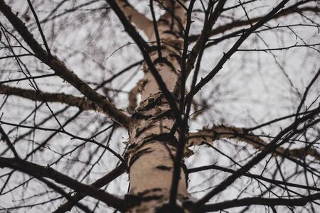 The white trunk of a birch with black branches close-up. Bottom-up. Abstract autumn sad background. Birch bark texture.
