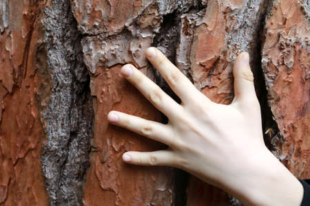 Human hands touch the bark of a tree, the concept of loving the world.