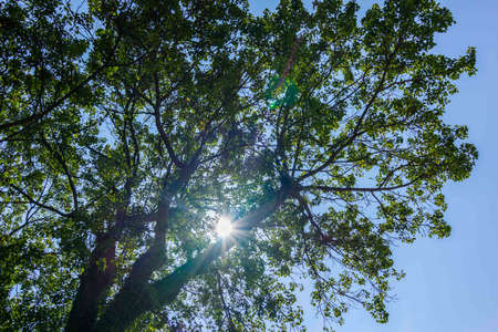 Looking up to an old tree and sunbeams through lush leaves. Summer chill background with old tree trunk and sun flare close up.