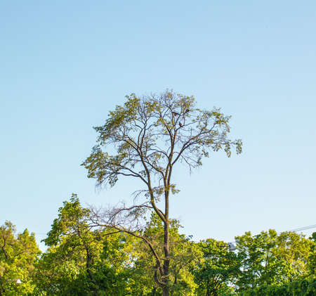 The sky shines through the crown of a tree with young spring leaves. View from below on the sprawling branches of a forest tree