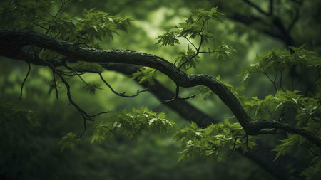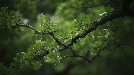 A rugged tree branch extending horizontally, adorned with vibrant green leaves, against a softly blurred green background, highlighting the beauty of nature.