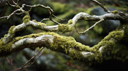 Lichen-covered tree branch in a serene forest bathed in warm morning light showcasing natures beauty
