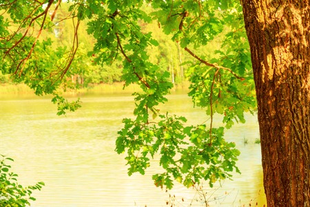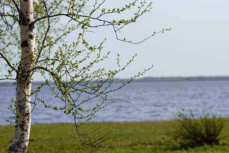 Leaves and branches of birch tree over the river or pond and warm sun shining through. Summer spring background. Selective focus shot with shallow DOF.