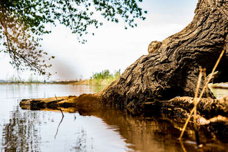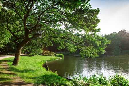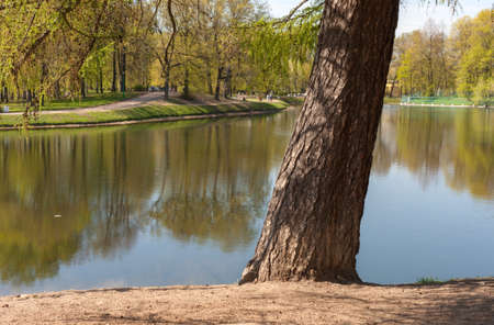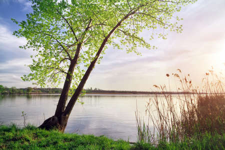 summer landscape. Tree with fresh green foliage against calm water in lake, pond, Dnieper river shore in sunny day. Recreation in nature reserve. Glare from the sun on the water. Calm riverscape view.