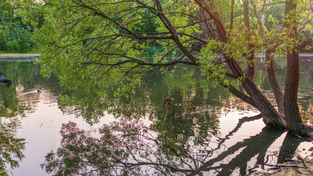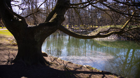 A huge branch of an old tree extending over a city lake in spring, with vibrant green leaves and calm waters reflecting the scene.